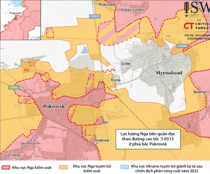 Cục diện chiến sự tại mặt trận Pokrovsk - Mirnograd tính đến ngày 18/11. Đồ họa: ISW