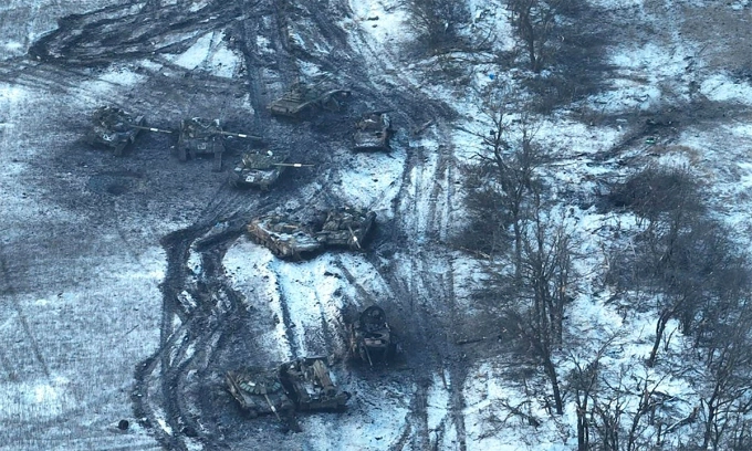 Xe tăng Nga bị Ukraine phá hủy trong trận phục kích gần thành phố Ugledar hồi tháng 2/2023. Ảnh: AP