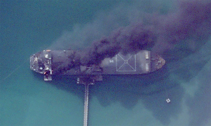 Chiến hạm IRINS Makran của Iran bốc cháy khi neo đậu tại cảng Bandar Abbas ngày 2/3. Ảnh: Planet Labs