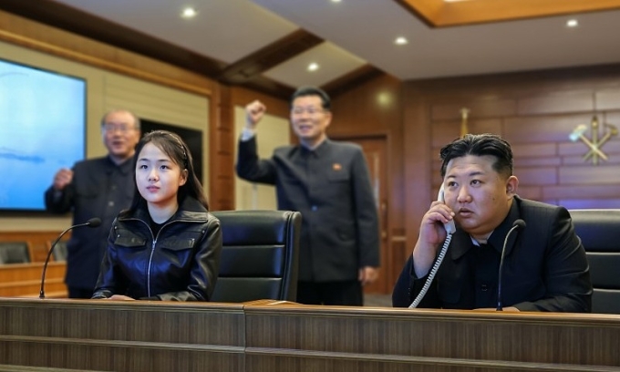 Hãng thông tấn trung ương Triều Tiên KCNA hôm nay công bố ảnh lãnh đạo Kim Jong-un chỉ đạo cuộc diễn tập phóng "tên lửa hành trình chiến lược" từ tàu khu trục Choe Hyon,trong khi con gái Kim Ju-ae mặc áo da và ngồi bên cạnh theo dõi sự kiện.