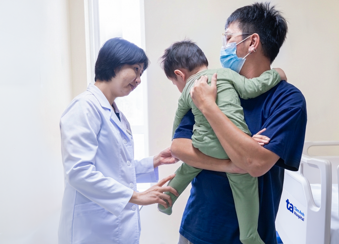 ThS.BS.CKI Tôn Thị Anh Tú,khám và tư vấn cho gia đình cách chăm sóc vết mổ cho Mạnh. Ảnh: Bệnh viện Đa khoa Tâm Anh