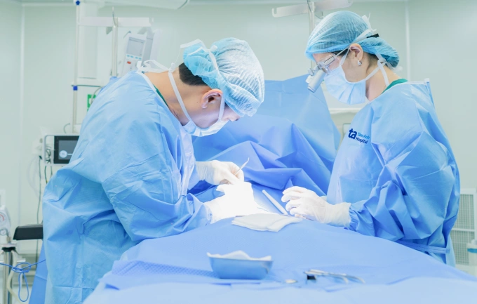 BS.CKII Nguyễn Đức Tuấn,Trưởng khoa Ngoại Nhi,cùng êkíp phẫu thuật cắt bao quy đầu cho trẻ. Ảnh: Bệnh viện Đa khoa Tâm Anh