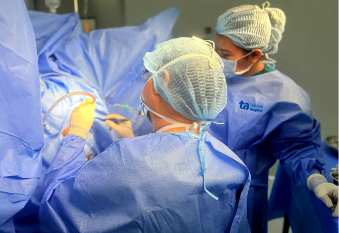 Bác sĩ Hậu đang phẫu thuật cắt vòng xơ,tạo hình hậu môn cho ông Toàn. Ảnh: Bệnh viện Đa khoa Tâm Anh