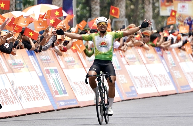 Tay đua Trịnh Đức Tâm mừng chiến thắng chặng 18 cuộc đua xe đạp xuyên Việt tranh Cup Truyền hình HTV 2026,trưa 22/4. Ảnh: Huy Phạm