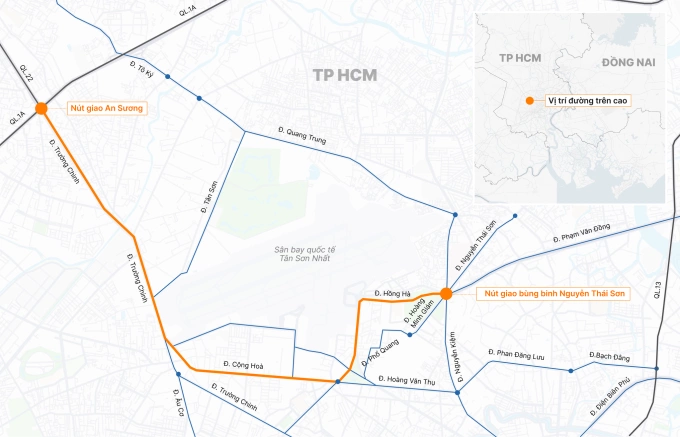 Hướng tuyến đường trên cao kết nối sân bay Tân Sơn Nhất được đề xuất. Đồ họa: Tâm Thảo